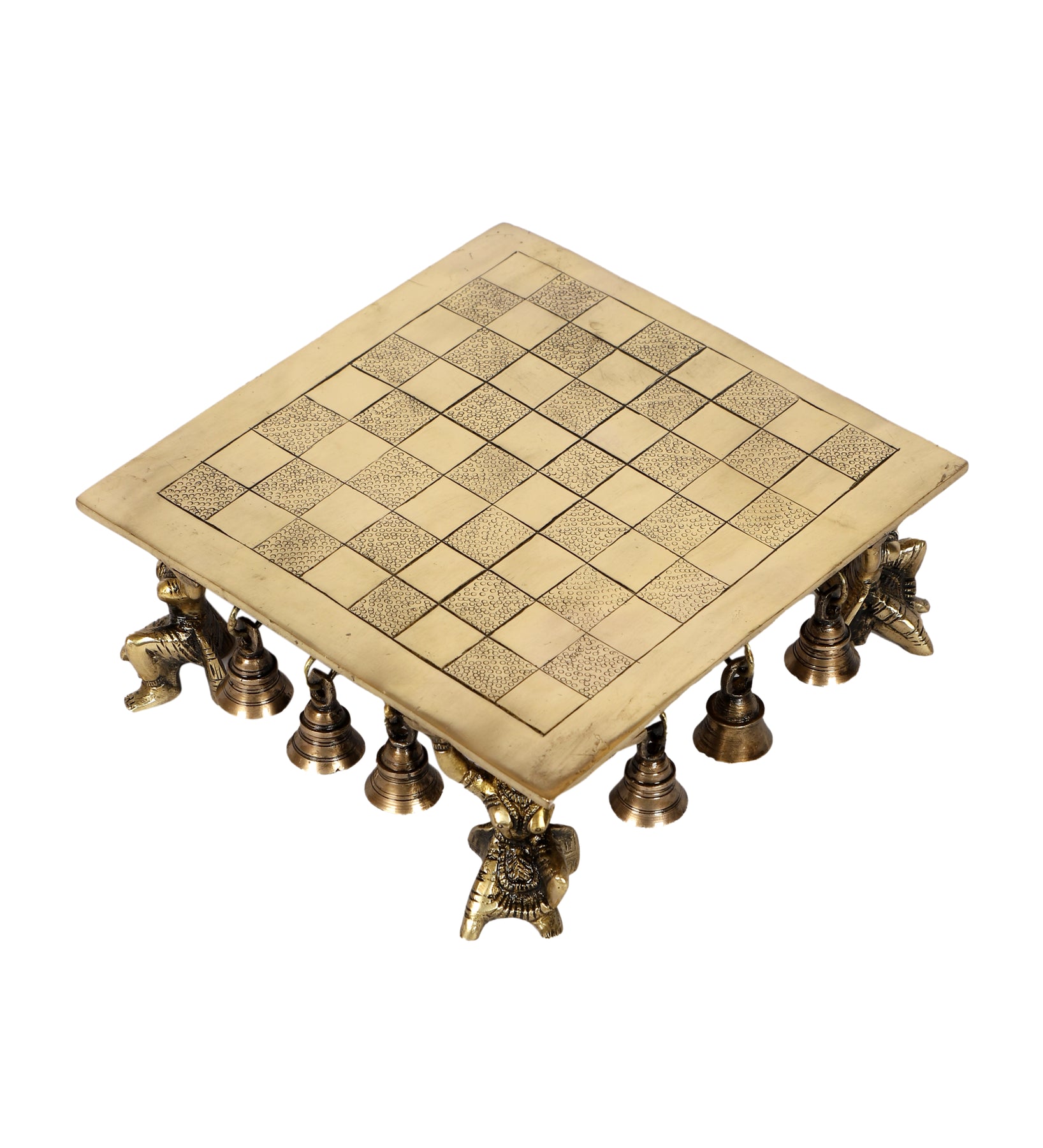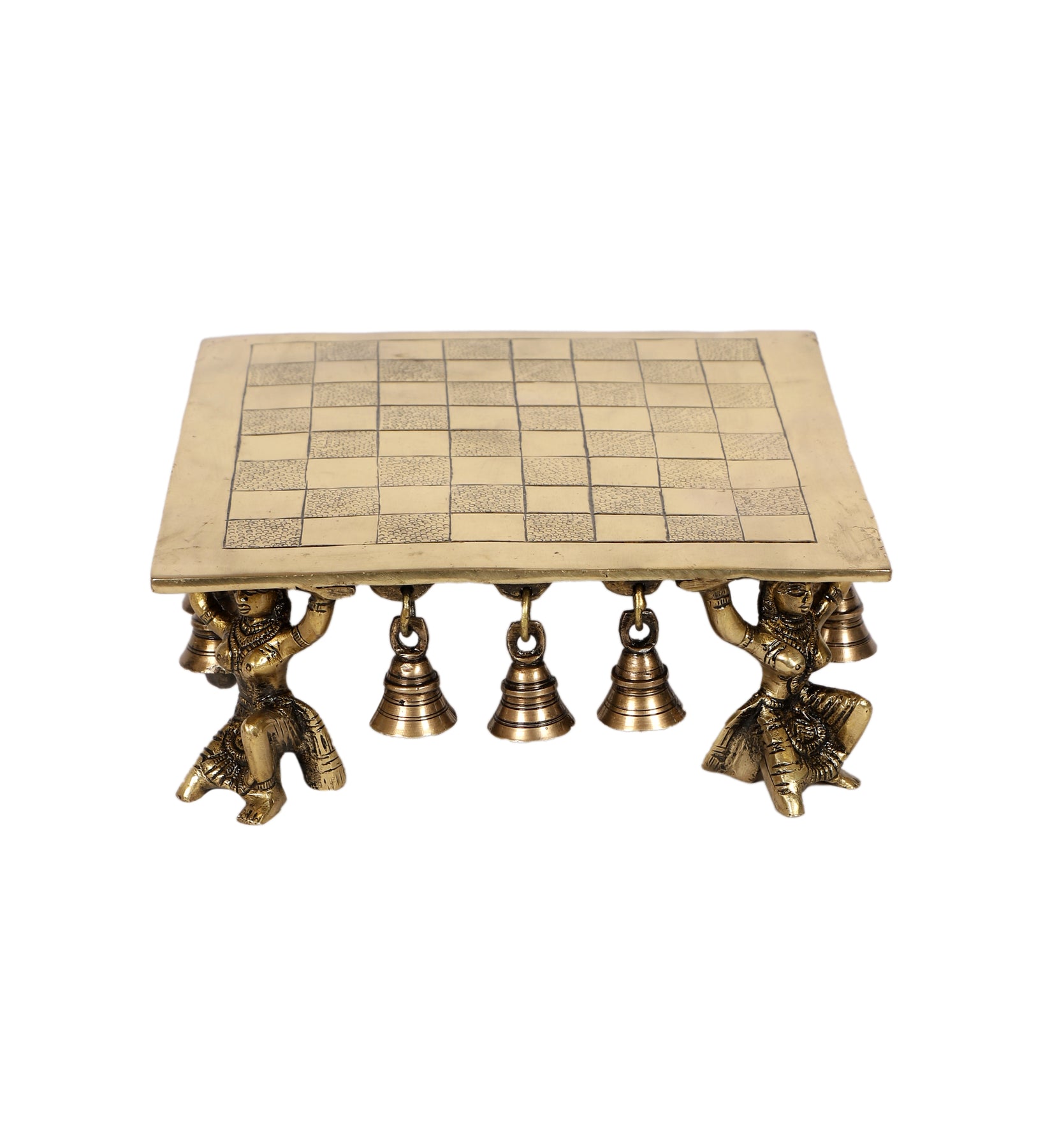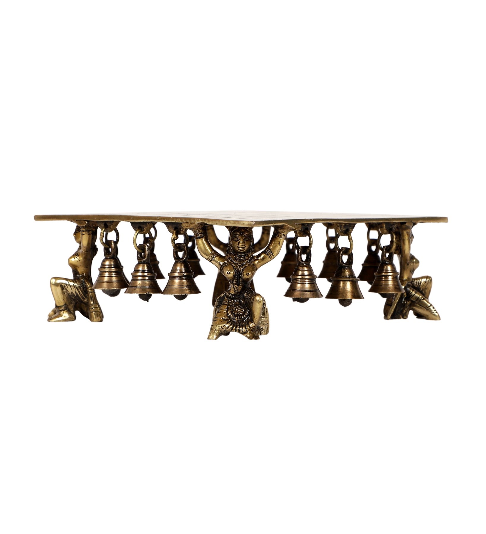 Package Contains: 1 Unit of Apsara Design Pillar Brass Chowki, Brass Pooja Chowki with Bells